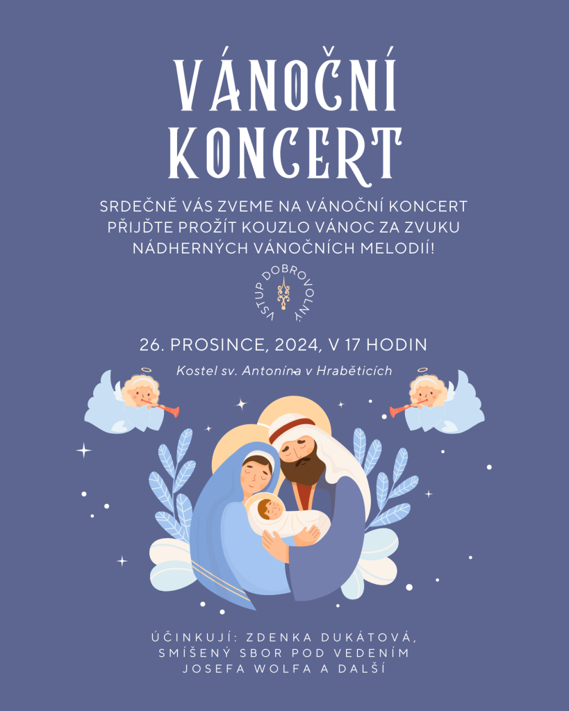 Zveme vás na vánoční koncert, který se uskuteční 26. prosince 2024 v 17 hodin v kostele sv. Antonína v Hraběticích. Na koncertě vystoupí Zdenka Dukátová, smíšený sbor pod vedením Josefa Wolfa a další umělci. Přijďte si užít kouzlo Vánoc za zvuku nádherných melodií.